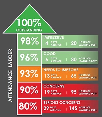 Often when we look at attendance, we look at percentages. However this doesn't always give us an accurate picture on what good or attendance that causes concern looks like. If you sat a test or exam and scored 80%, I have no doubt many of you would be really pleased. When it comes to attendance, anything below 95% begins to cause concern in the number of hours in lost learning.